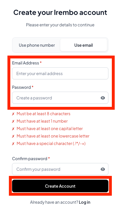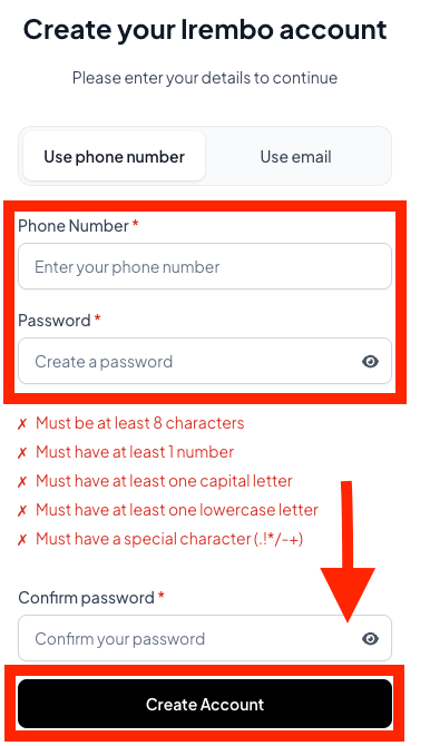 Submit Required Information: Enter your phone number or email address and password, confirm it, and then click on “ Create account.”
