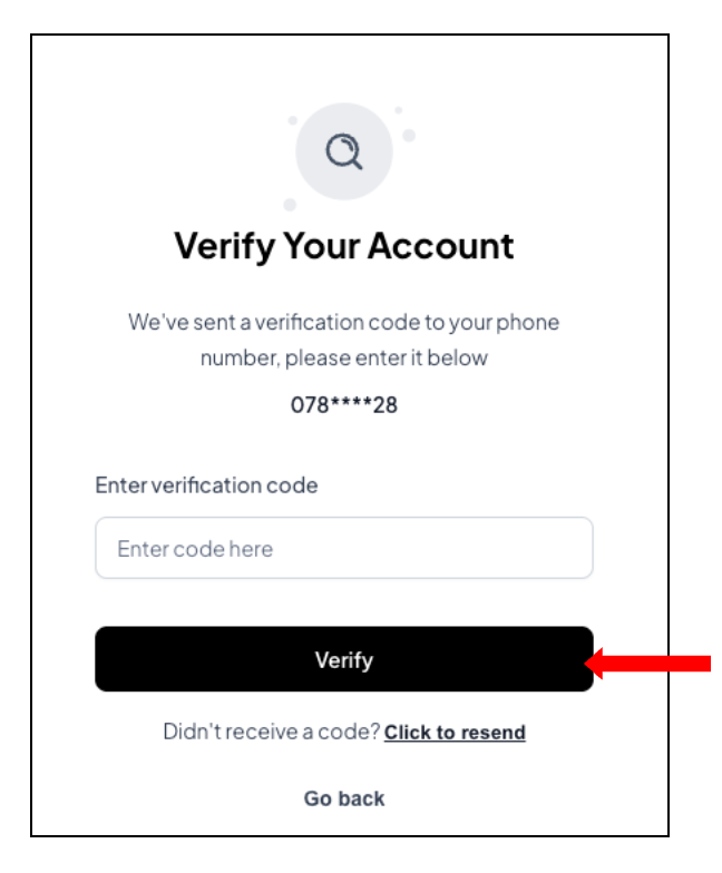 Account Verification: A verification code/One-Time Password (OTP) is sent to your phone number via SMS notification or Email. Enter the OTP and click on Verify.