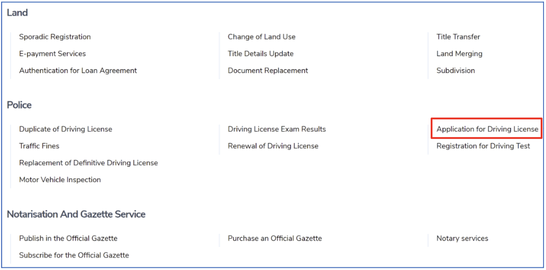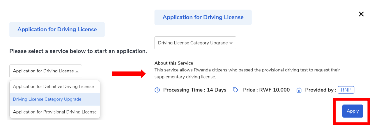 This service allows Rwandan citizens who passed the supplementary practical driving test to request a supplementary driving license. The service is provided by the Rwanda National Police (RNP).