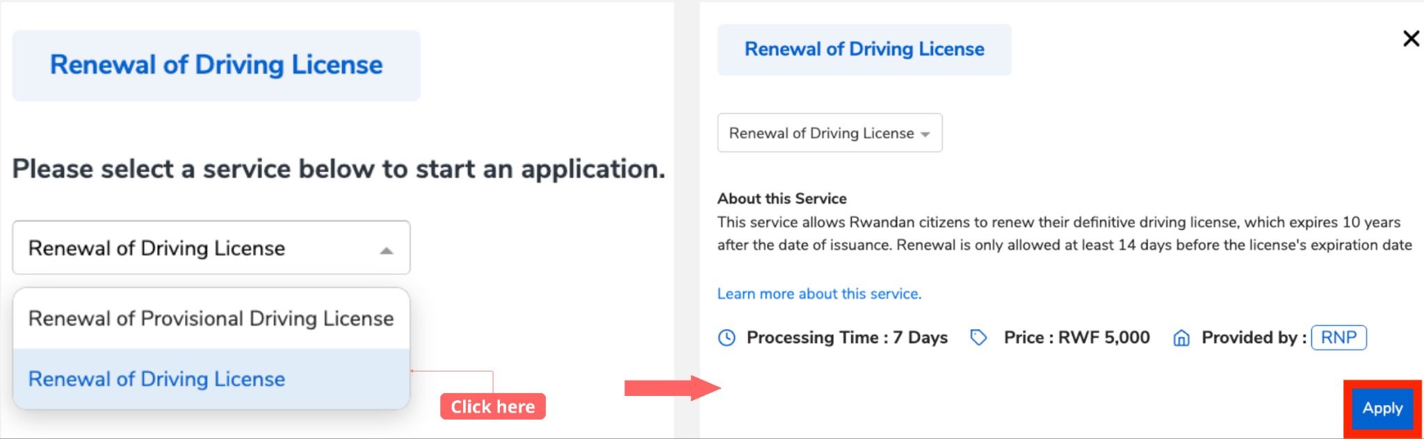 Visit www.irembo.gov.rw and under Police, click on Renewal of Driving Licenses.