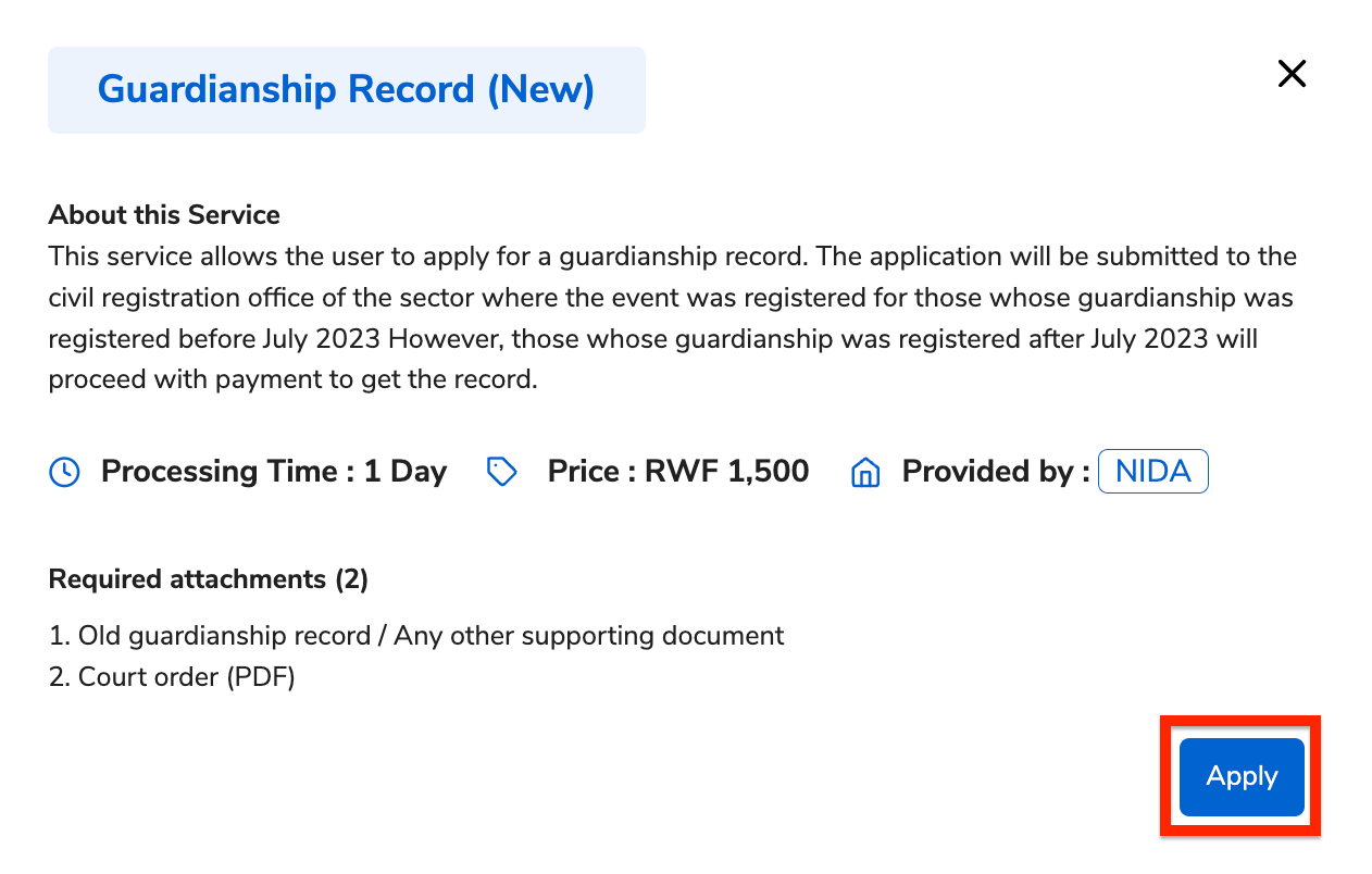 This service allows the user to apply for a guardianship record. The application will be submitted to the civil registration office of the sector where the event was registered for those whose guardianship was registered before July 2023 However, those whose guardianship was registered after July 2023 will proceed with payment to get the record. This service is provided by the Ministry of Local Government (MINALOC).