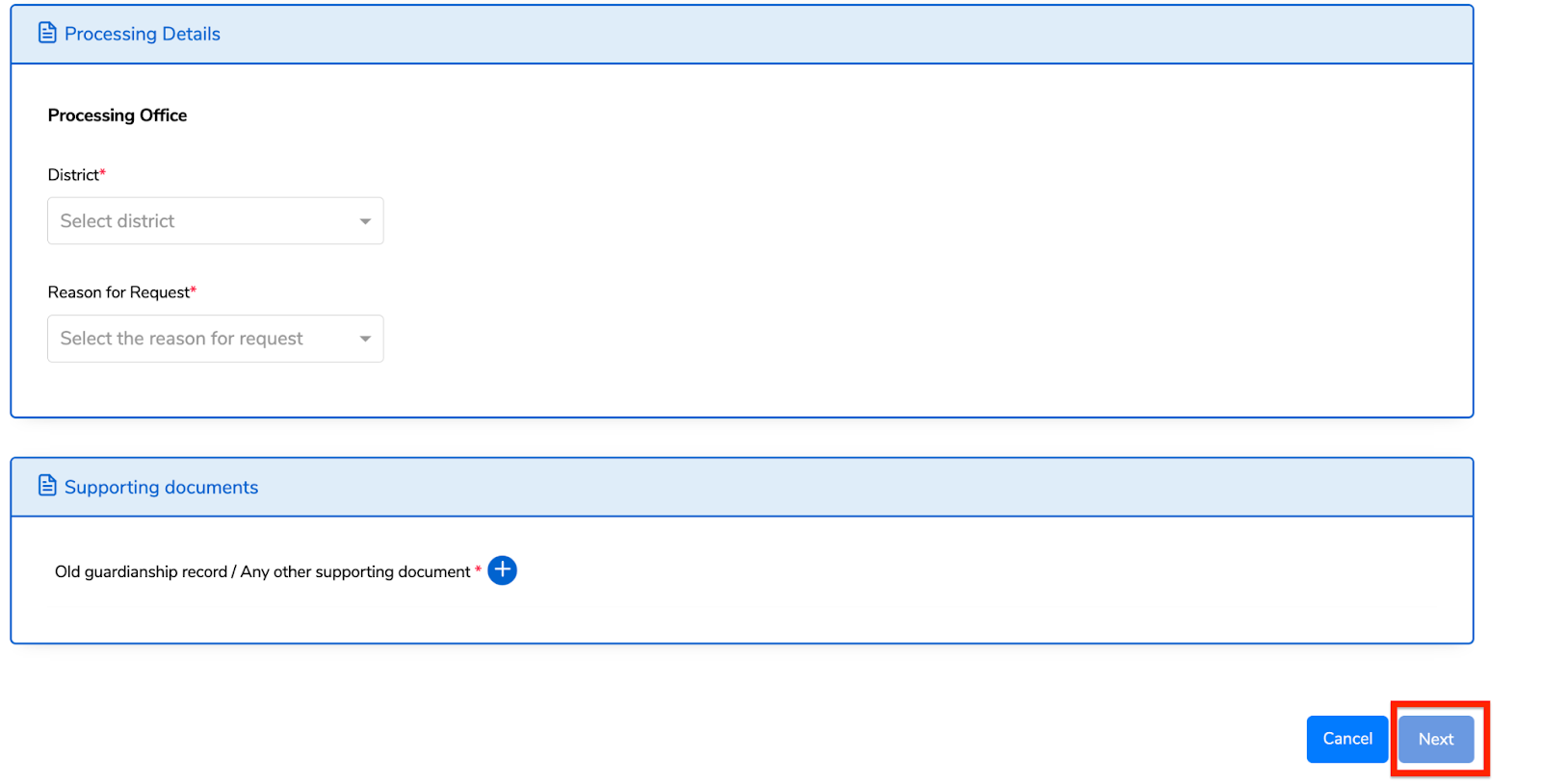 Once the Guardianship record is registered in the Civil Registration System, the information about the Guardianship record is automatically fetched and the applicant does not fill out any other details should they apply for a guardianship record again. Applicants receive their Guardianship record as soon as they pay. No Civil Registration Officer (CRO) action is needed. The CRO action is only needed when the user is not registered in the Civil Registration System.
