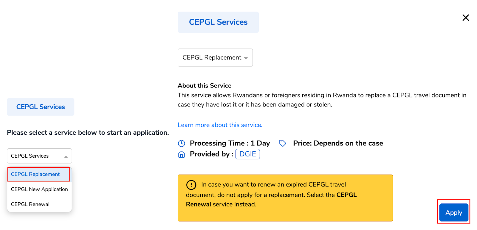 Select which service you want; “CEPGL Replacement,” and click on Apply.