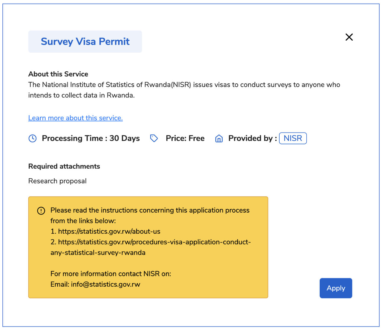 The National Institute of Statistics of Rwanda (NISR) issues visas to conduct surveys to anyone who intends to collect data in Rwanda.