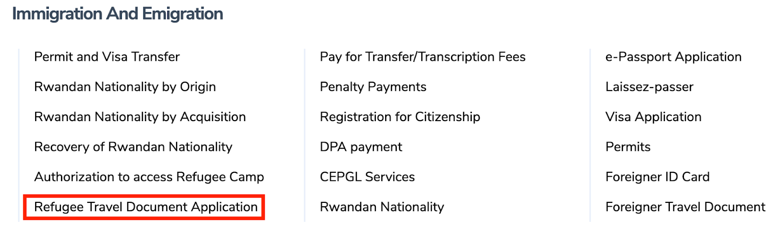 Visit www.irembo.gov.rw and under Immigration and Emigration, click on Refugee Travel Document Application.