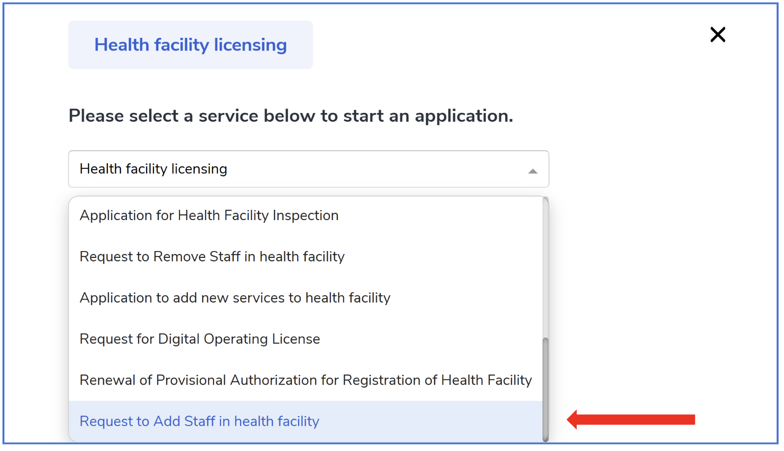 This service is offered to private health facilities requesting to add new staff. This is done when there is a change in staffing. The service is provided by the Ministry of Health (MOH).