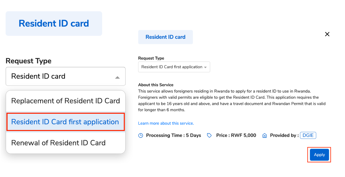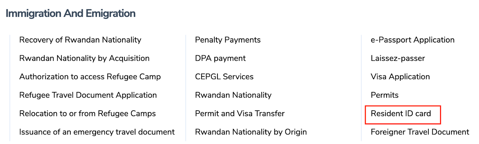 Visit www.irembo.gov.rw and under Immigration and Emigration, click on Resident ID Card.