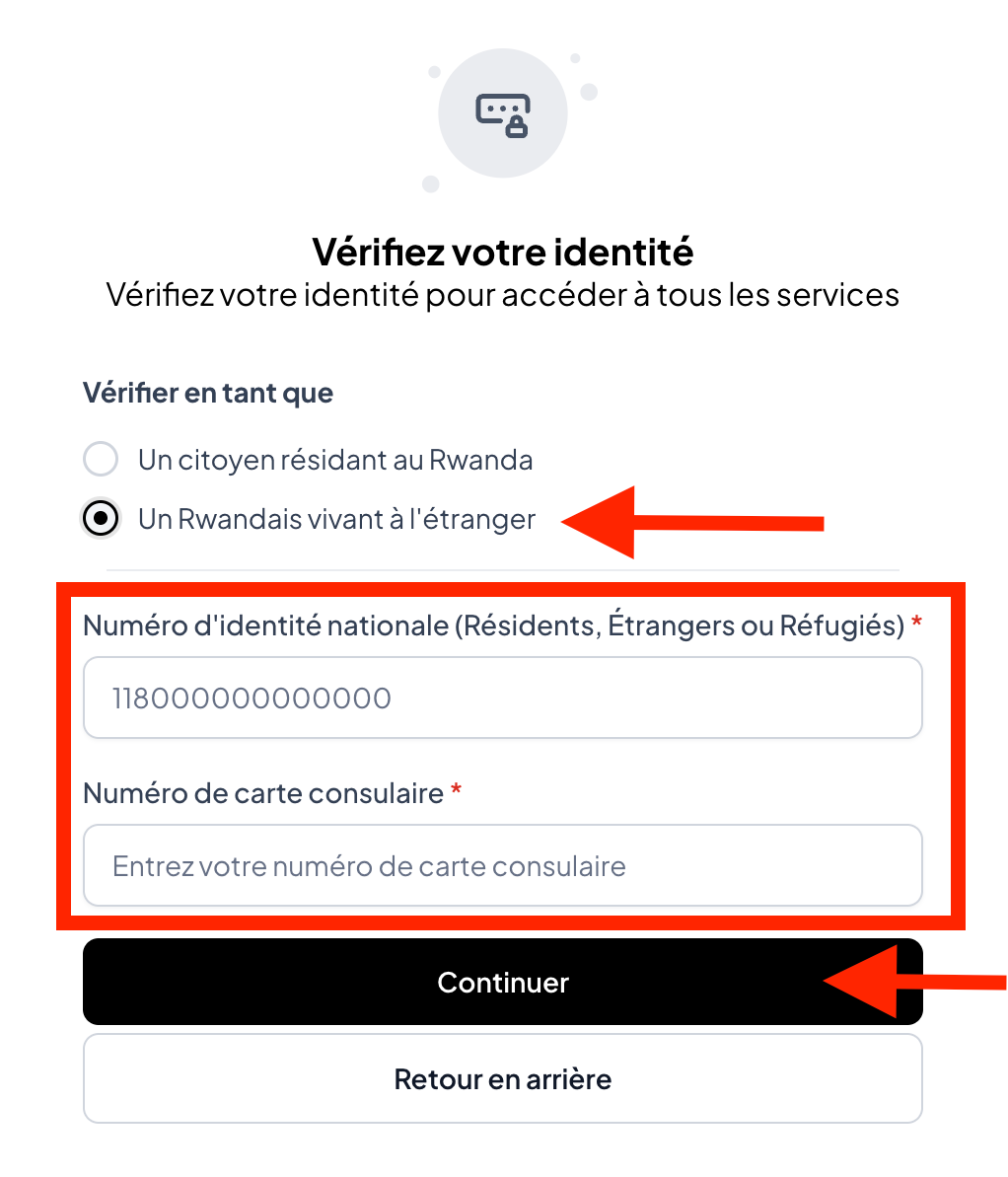 -Si vous êtes un Rwandais vivant dans la diaspora, vous devrez utiliser une carte d'identité nationale Rwandaise et un numéro de carte consulaire. Cliquez sur « Continuer » pour procéder.