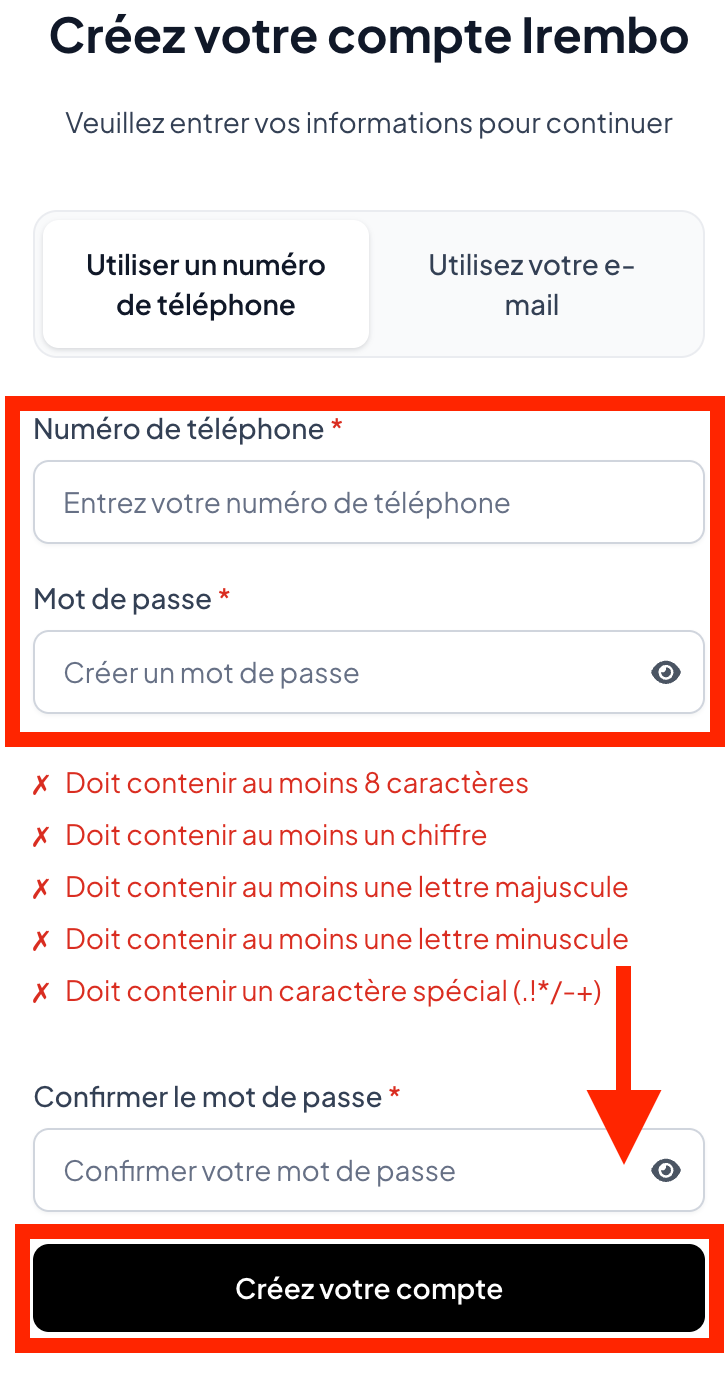Soumettez les informations requises : Entrez votre numéro de téléphone ou votre adresse e-mail et votre mot de passe, confirmez-le, puis cliquez sur "Créer un compte".