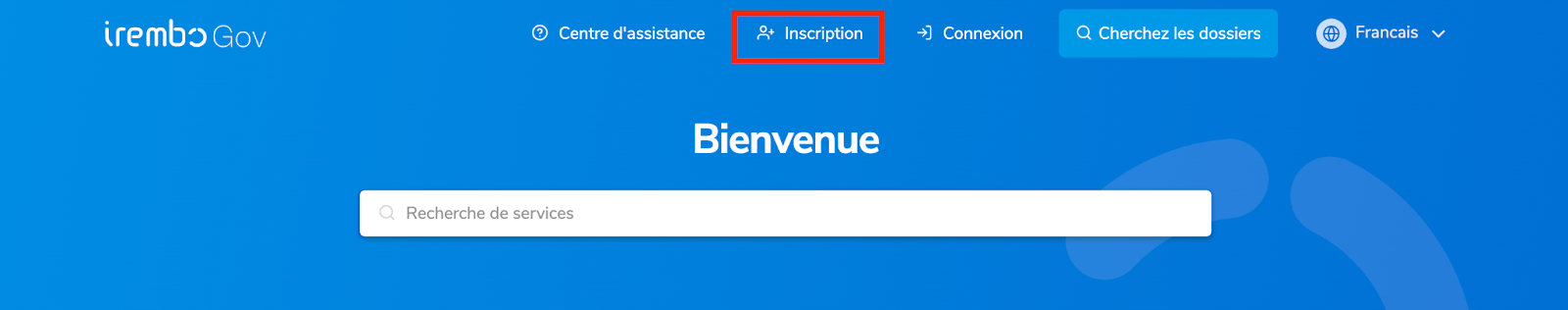 Visitez la plateforme Irembo : www.irembo.gov.rw et cliquez sur Inscription.
