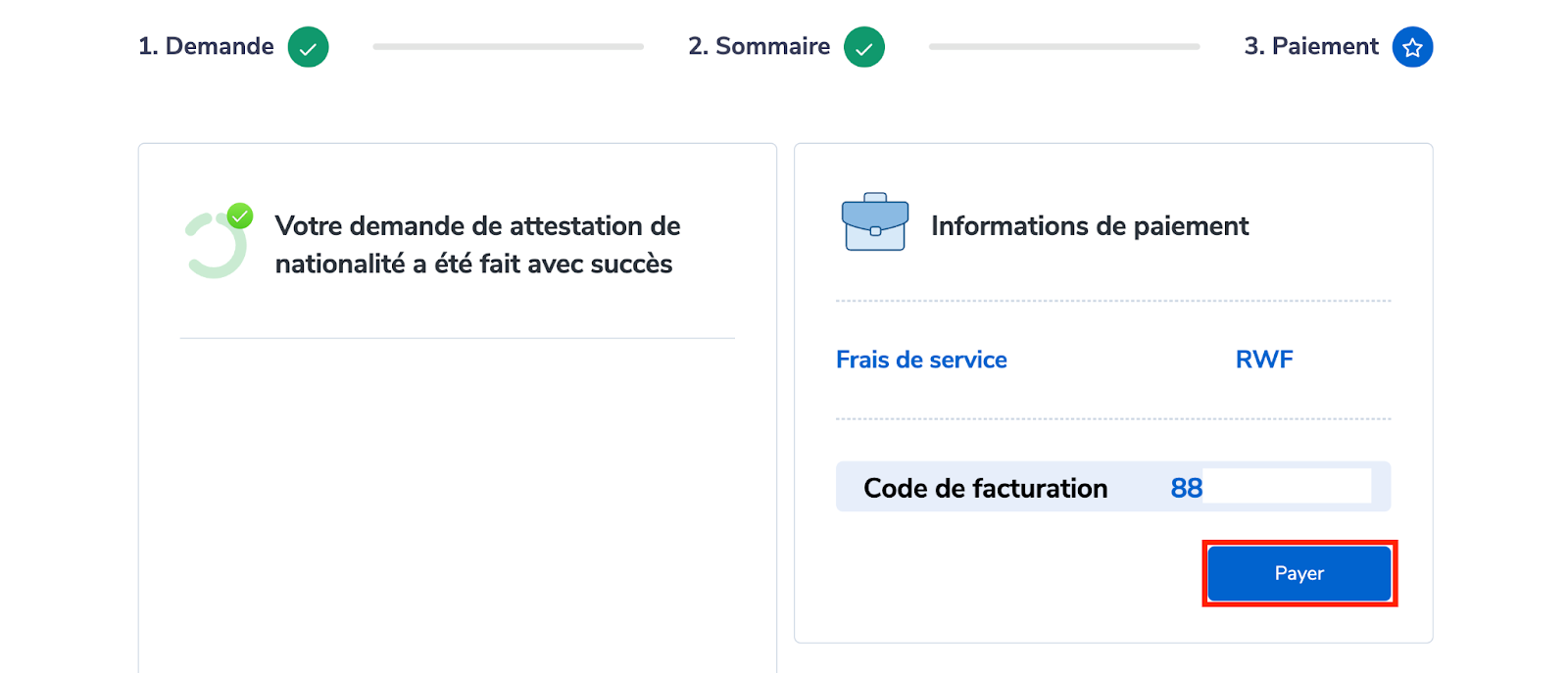 Code de facturation : Il s’agit d’un code unique que vous recevez via le contact (numéro de téléphone ou un e-mail) que vous avez fourni lors de la soumission de votre demande. Ce code est utilisé pour effectuer votre paiement.