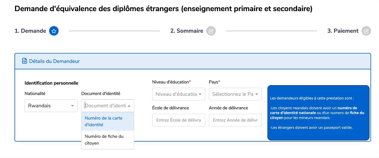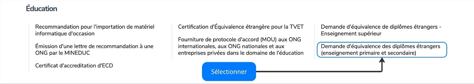 Visitez www.irembo.gov.rw et, sous Éducation, cliquez sur « Demande d'équivalence des diplômes étrangers (enseignement primaire et secondaire)».