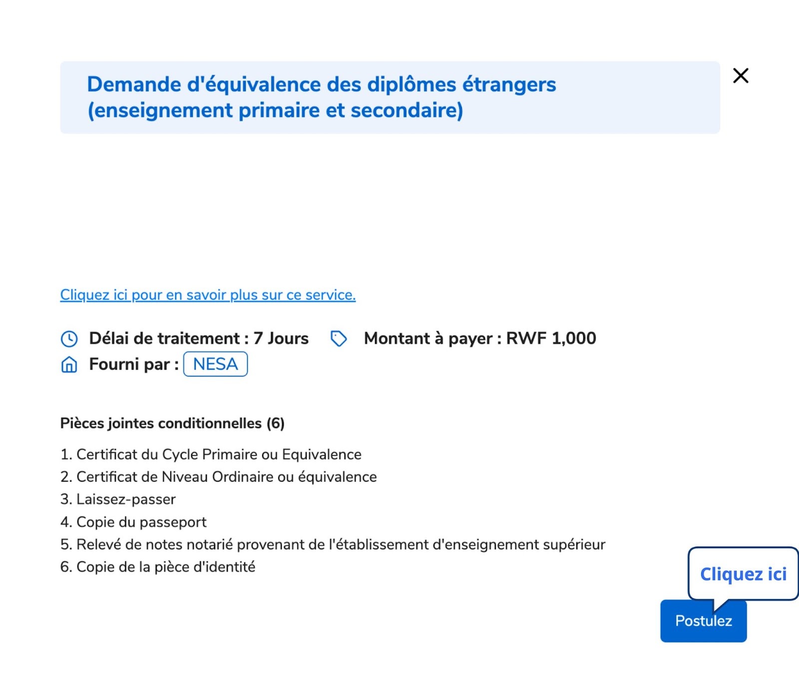 NOTE : Après avoir postulé et payé avec succès via IremboGov, la demande est envoyée à la National Examination and School Inspection Authority(NESA) pour traitement. Si elle est jugée authentique, la demande sera approuvée.