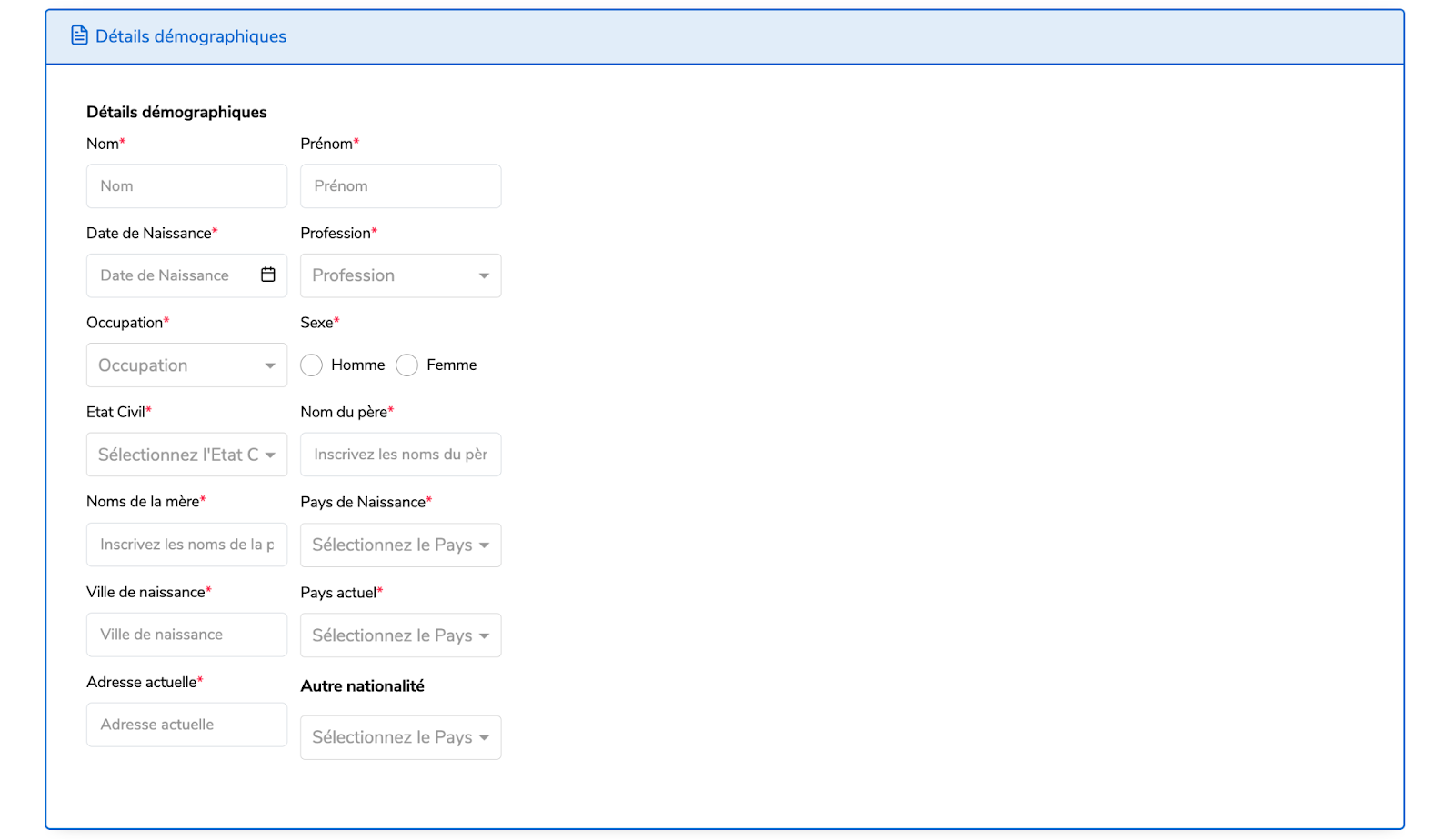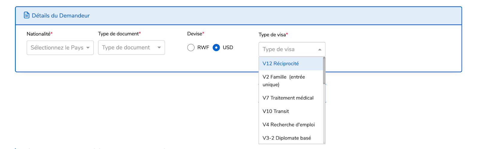Les demandeurs doivent disposer d’une nationalité et d’un type de document.