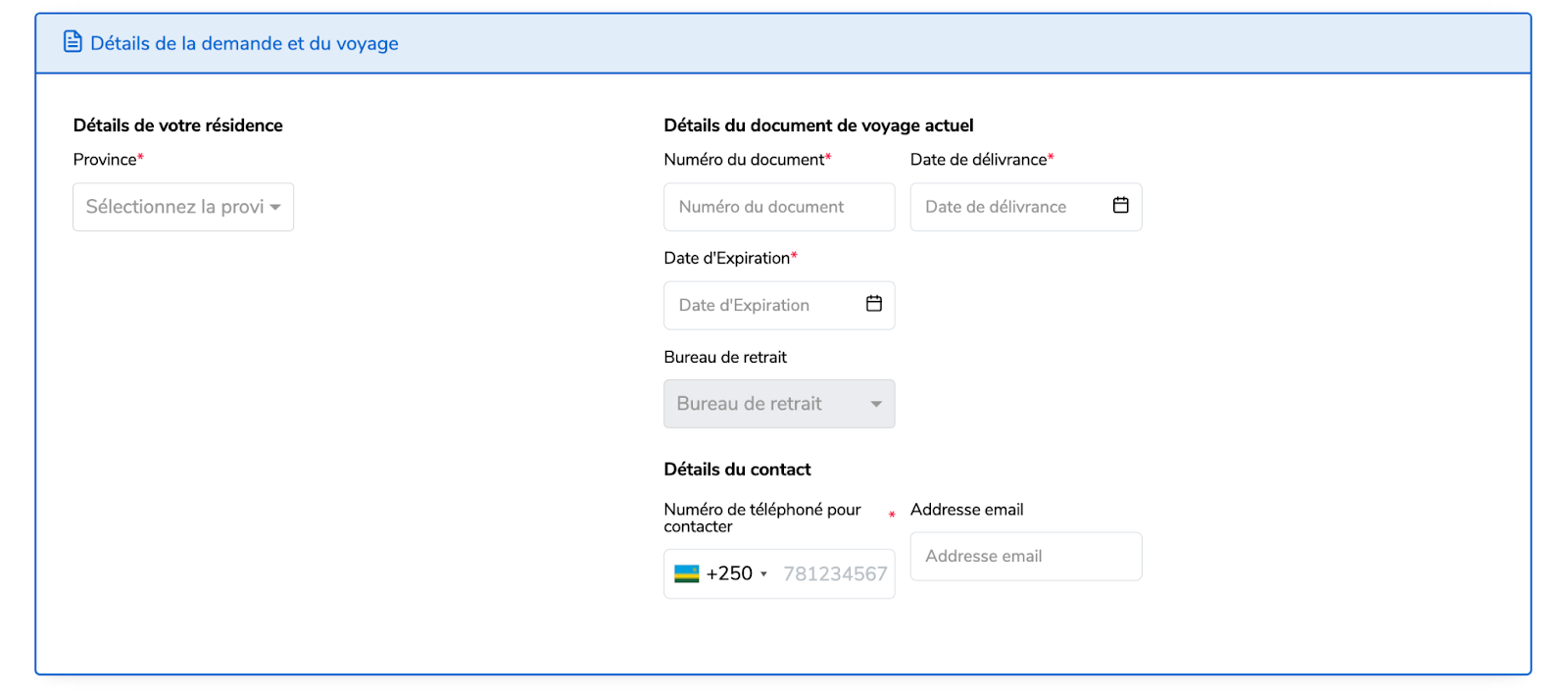 Saisissez les détails de la demande et du voyage. Le bureau de retrait est automatiquement défini en fonction des informations de résidence du demandeur.