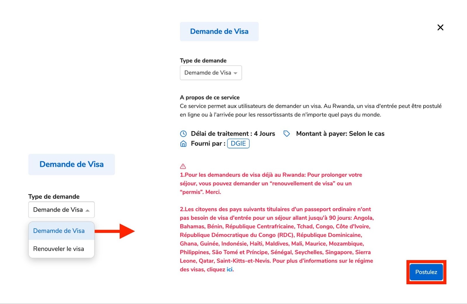 Note : Pour les demandeurs de visa déjà au Rwanda: Pour prolonger votre séjour, vous pouvez demander un “renouvellement de visa” ou un “permis”.