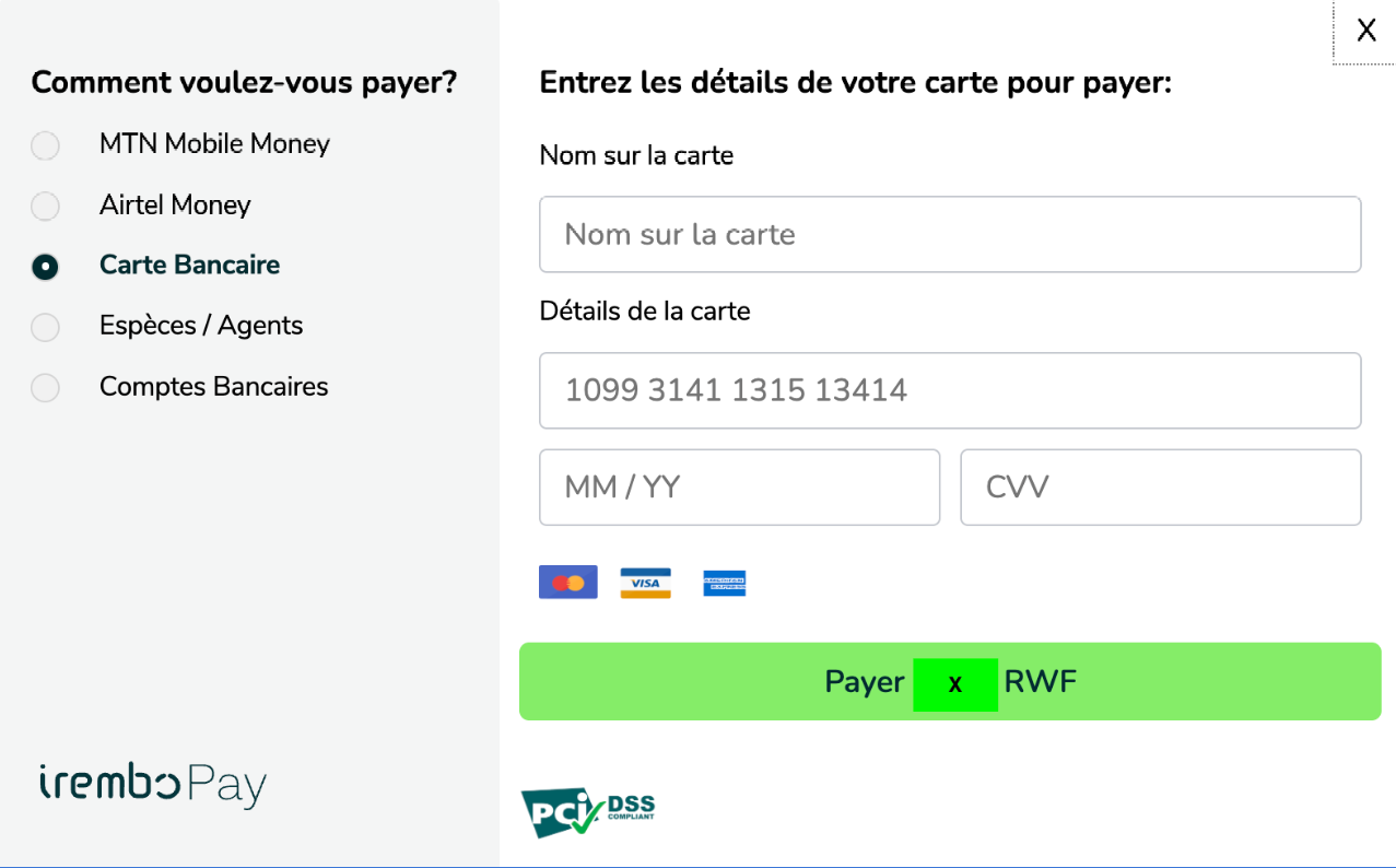 hors ligne (Bank of Kigali), ou en ligne (Visa ou MasterCard). Pour plus d’informations sur les modes de paiement, cliquez ici.