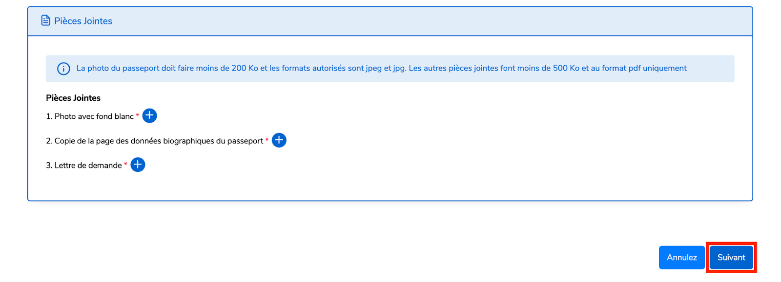 Les pièces jointes varient selon le type de visa. Les documents généralement requis sont :
