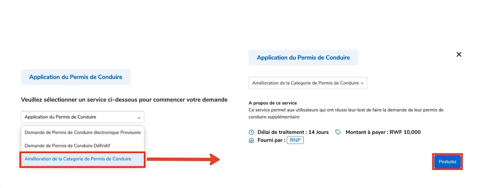 Visitez www.irembo.gov.rw et Sous Police, cliquez sur Application du Permis de Conduire.