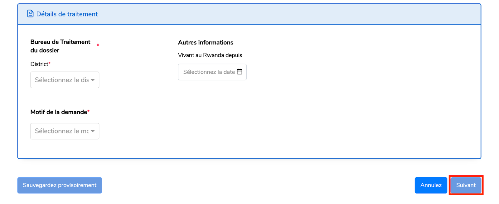 NOTE : Le bureau choisi doit correspondre au lieu de résidence du demandeur au Rwanda.