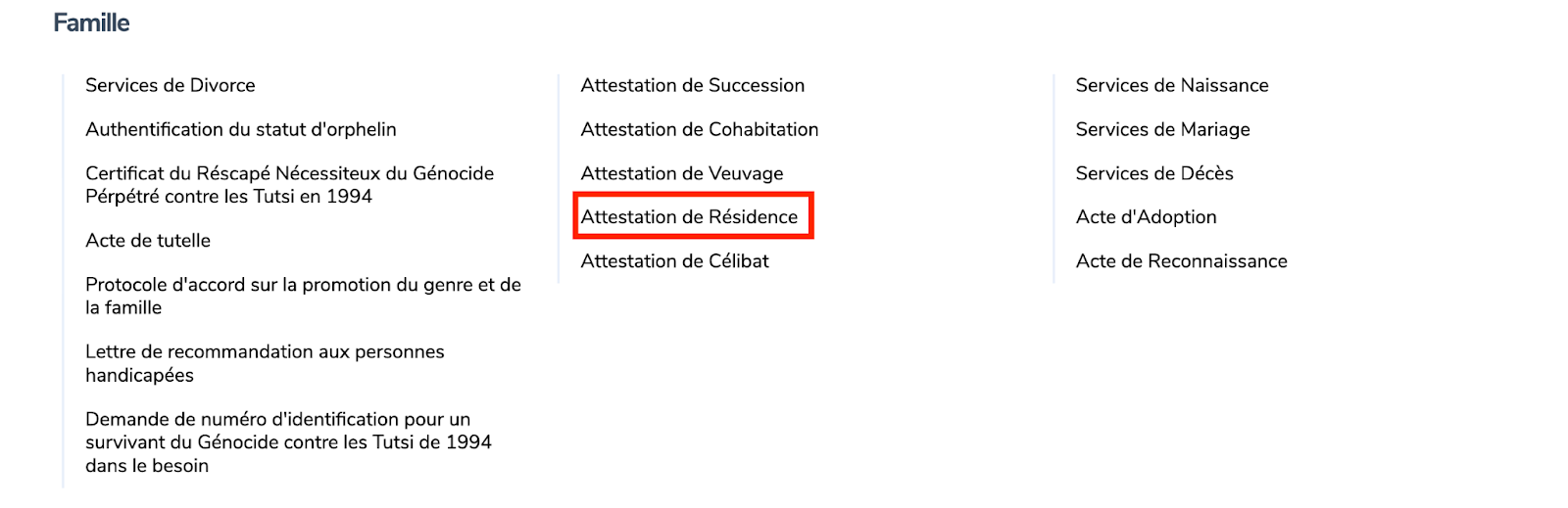 Sous Famille, cliquez sur Attestation de Résidence.