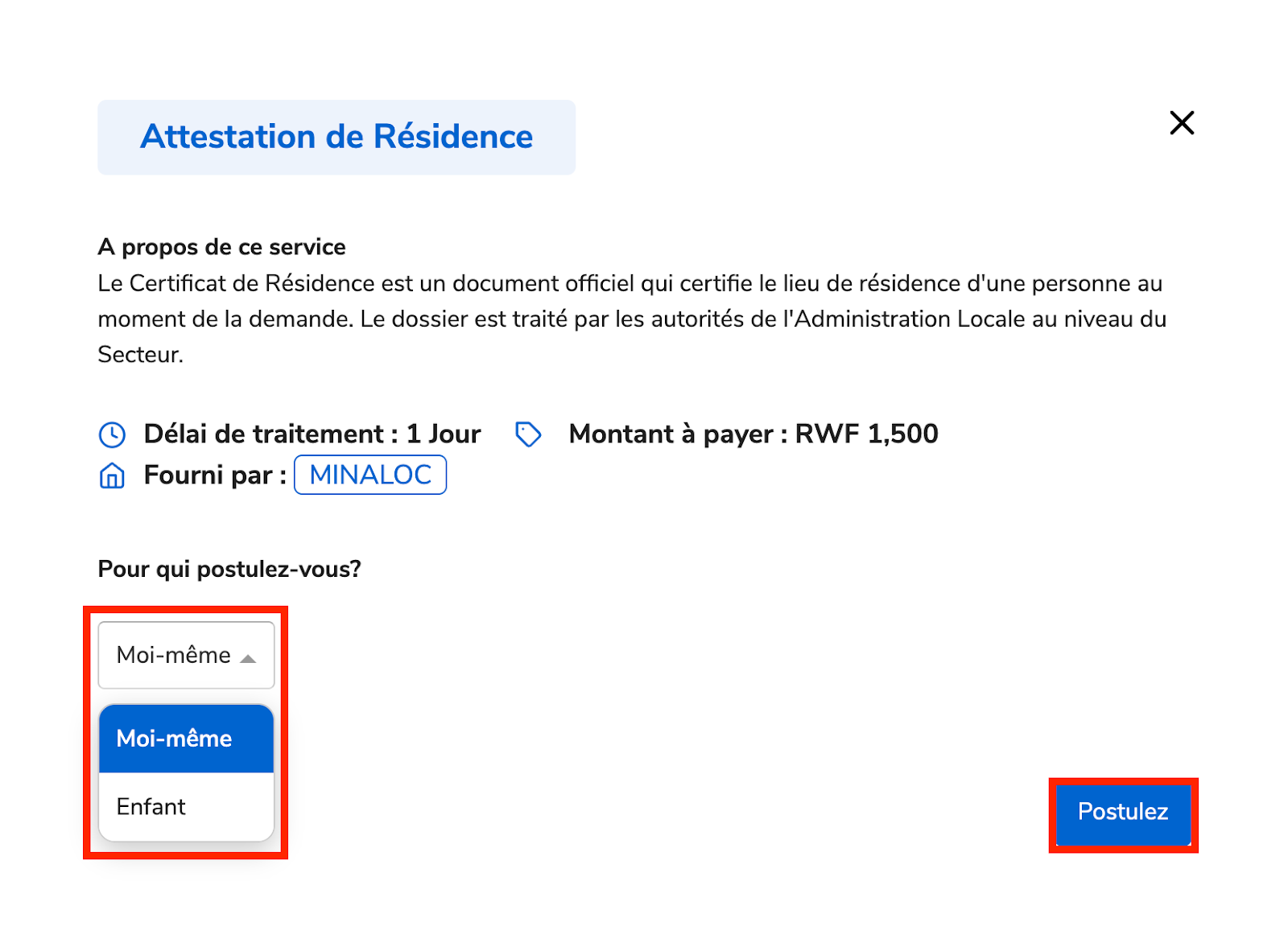 Le délai de traitement est de 1 jour ouvrable et le coût du service est de 1,500 Rwf.