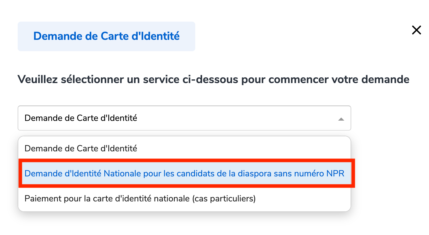 Sélectionnez “Demande d'identité Nationale pour les candidats de la diaspora sans numéro NPR”.