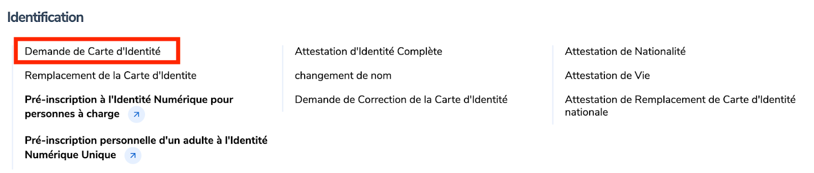 Rendez-vous sur www.irembo.gov.rw , sous “Identification” , choisissez “Demande de carte d'identité”.