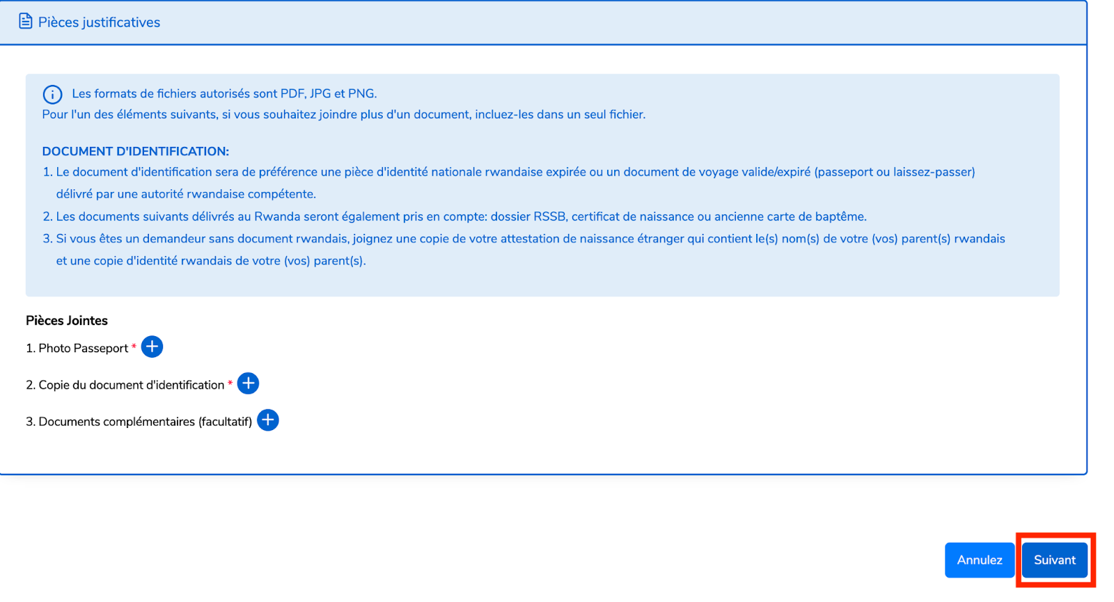 Autres documents acceptés (délivrés au Rwanda) : Un relevé de la RSSB, un acte de naissance ou une ancienne carte de baptême.