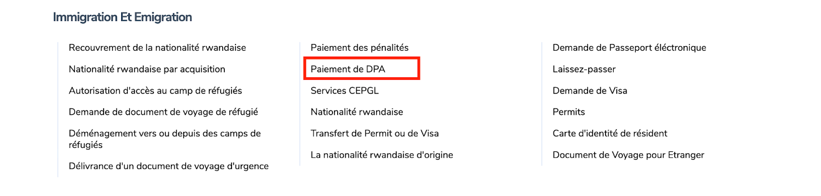 1. Rendez-vous sur www.irembo.gov.rw et, sous la catégorie Immigration et Émigration, cliquez sur Paiement de DPA.