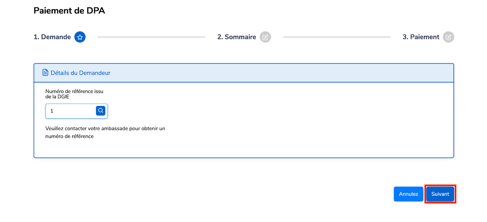 NOTE : Le numéro de référence est fourni par la DGIE après avoir rempli le formulaire de demande à l'ambassade.