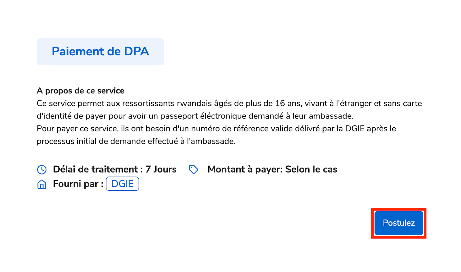 Ce service permet aux Rwandais âgés de 16 ans et plus, résidant à l'étranger et sans identifiant national rwandais, de payer un passeport électronique demandé auprès de leur ambassade. Pour payer ce service, les citoyens ont besoin d'un numéro de référence valide délivré par la Direction Générale de l'Immigration et de l'Émigration (DGIE) après la procédure de demande initiale à l'Ambassade du Rwanda.