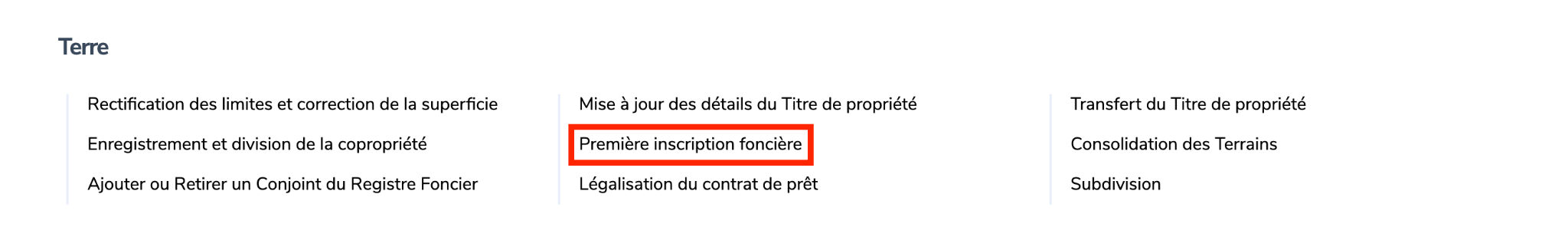 Dans la section “Terre”, cliquez sur “Première inscription foncière”.