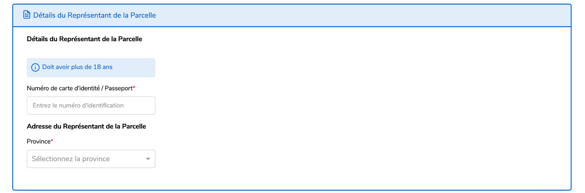 Saisissez le numéro de la pièce d’identité ou du passeport du représentant de la parcelle ainsi que son adresse.