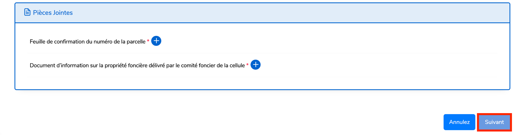 Joignez les documents demandés, puis cliquez sur Suivant pour continuer.