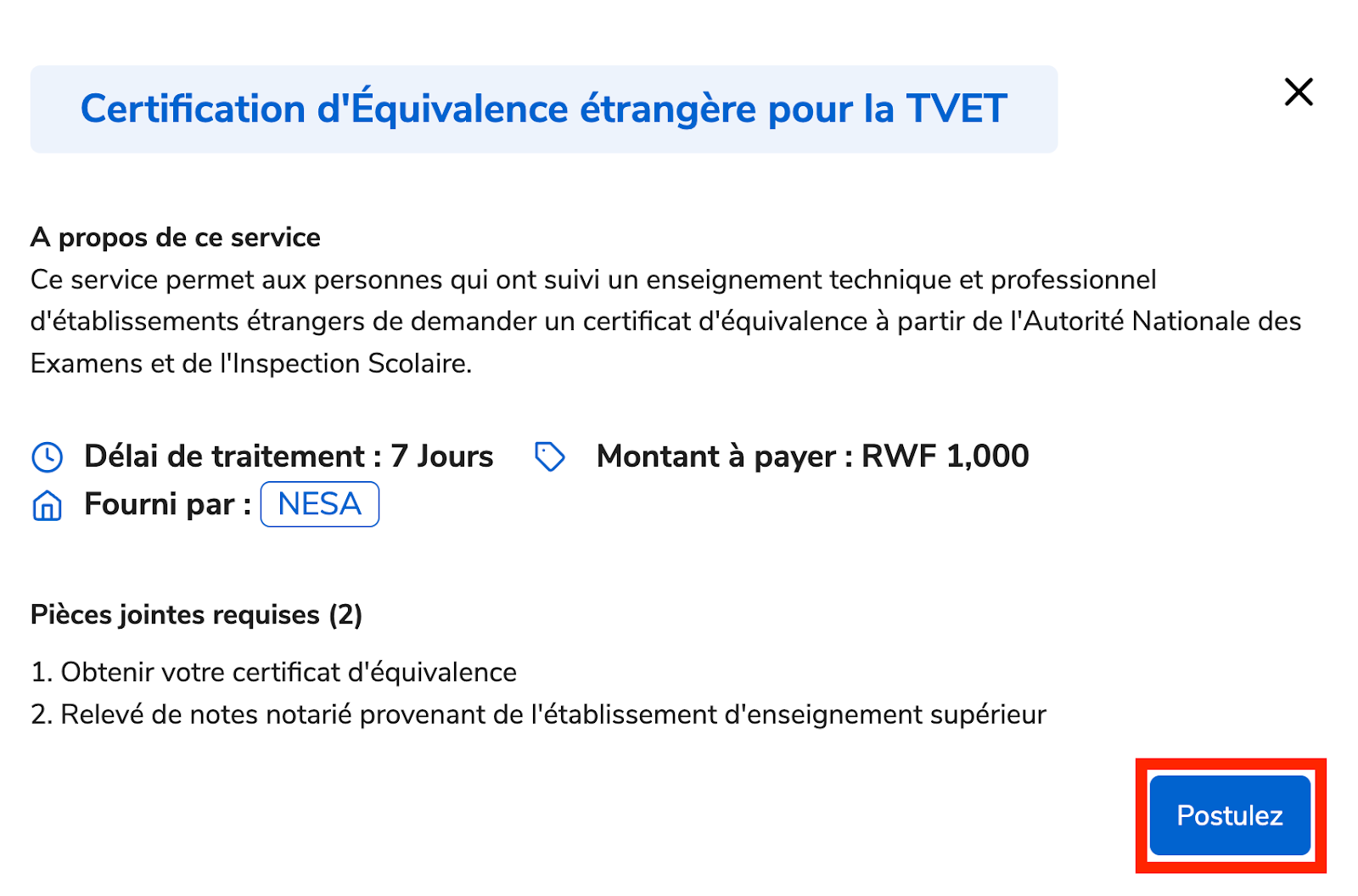 Ce service permet aux Rwandais et aux étrangers ayant reçu une éducation technique et professionnelle d'institutions étrangères de demander un certificat d'équivalence auprès de la National Examination and School Inspection Authority (NESA).