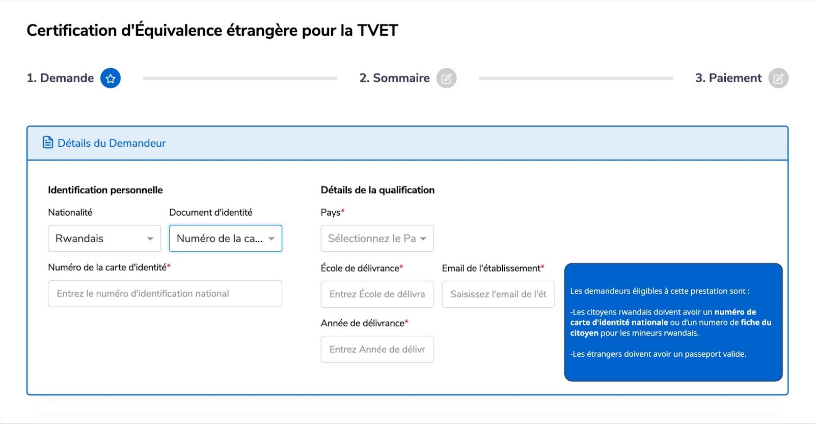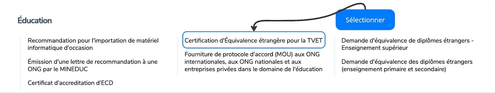 Visitez www.irembo.gov.rw et, sous Éducation, cliquez sur « Certification d'Équivalence étrangère pour la TVET».
