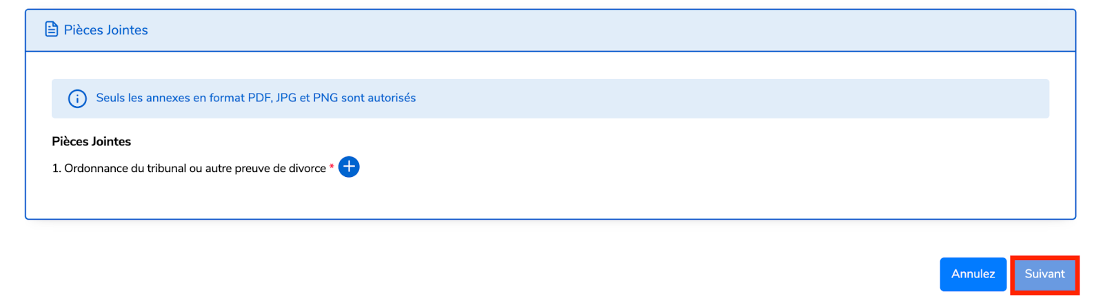 Joignez le document requis dans le format et la taille appropriés, puis cliquez sur Suivant pour continuer.