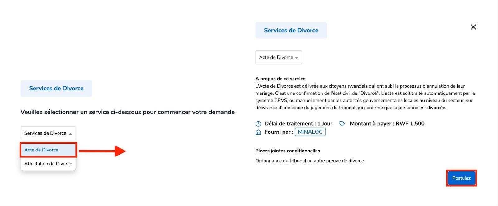 Sélectionnez Acte de divorce, puis cliquez sur Postulez.