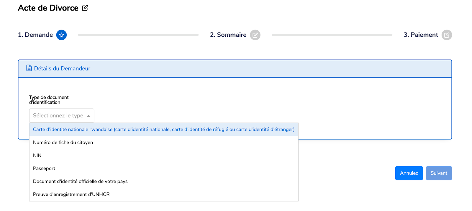 Ce service électronique permet aux citoyens rwandais ayant achevé la procédure d’annulation de leur mariage de demander un acte de divorce. La demande est soit traitée automatiquement et générée par le système CRVS, soit traitée manuellement par les autorités gouvernementales locales au niveau du secteur.