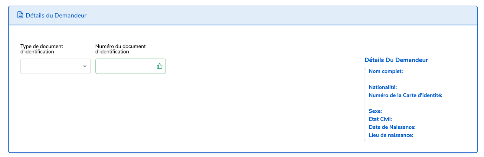Sélectionnez le type de document d’identification dont dispose le demandeur : numéro d’identification nationale, numéro de fiche du citoyen, NIN, numéro de passeport, pièce d’identité officielle de votre pays ou une preuve d'enregistrement du HCR. Les informations seront récupérées et affichées sur le côté droit de la page.