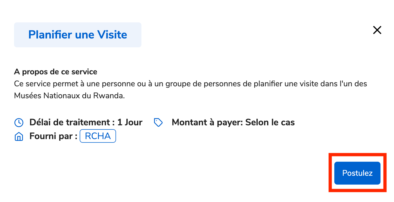 Rendez -vous sur www.irembo.gov.rw , sous Visite de Musees,Mausolées et Mémoriaux,Choisissez “Planifier une visite”.