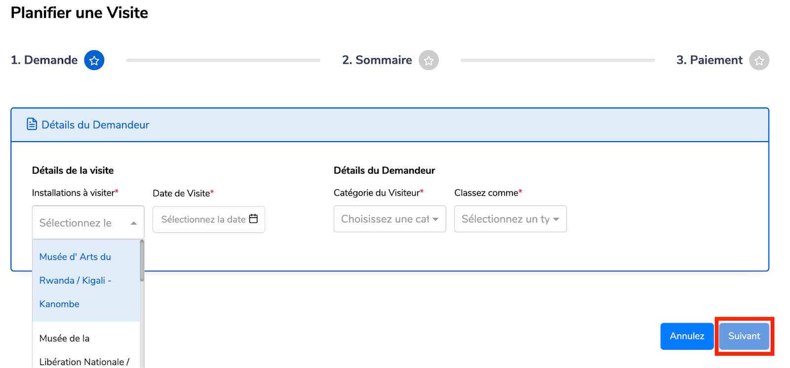 Choisissez l’installation à visiter,la date de visite,et remplissez les détails du demandeur.Les détails seront récupérés et affichés sur le côté droit de la page.