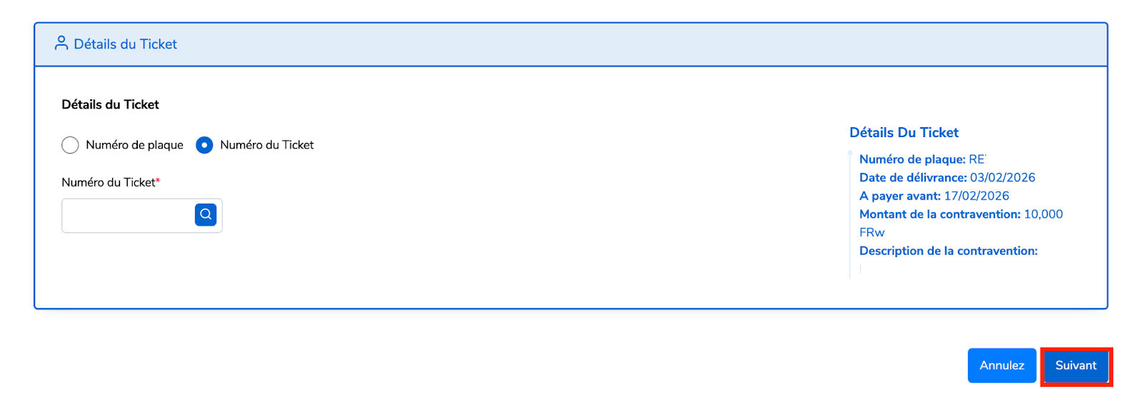 Cette section explique comment un demandeur peut payer ses amendes en utilisant le numéro de plaque associé au TIN correspondant ou le numéro du ticket. Le numéro du ticket est attribué à un conducteur ayant enfreint les règles de circulation et de sécurité routière. Les demandeurs peuvent payer une ou plusieurs amendes, selon leurs moyens financiers.