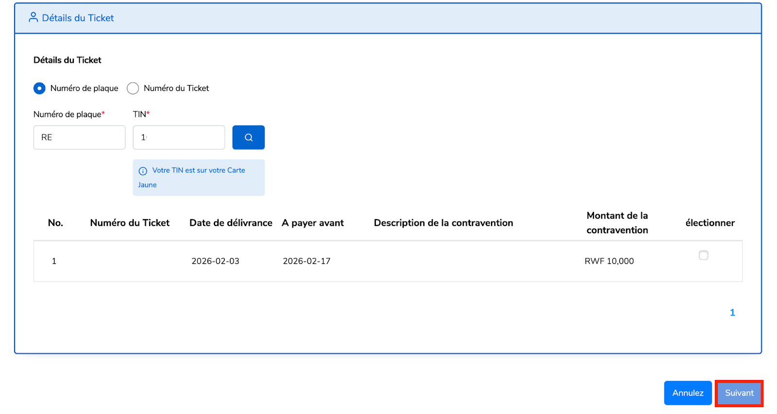 1. Pour payer, le demandeur peut soit entrer le numéro de plaque avec le TIN (le TIN se trouve sur la carte jaune), soit le numéro du ticket, puis sélectionner les amendes qu’il souhaite payer (toutes ou certaines).
