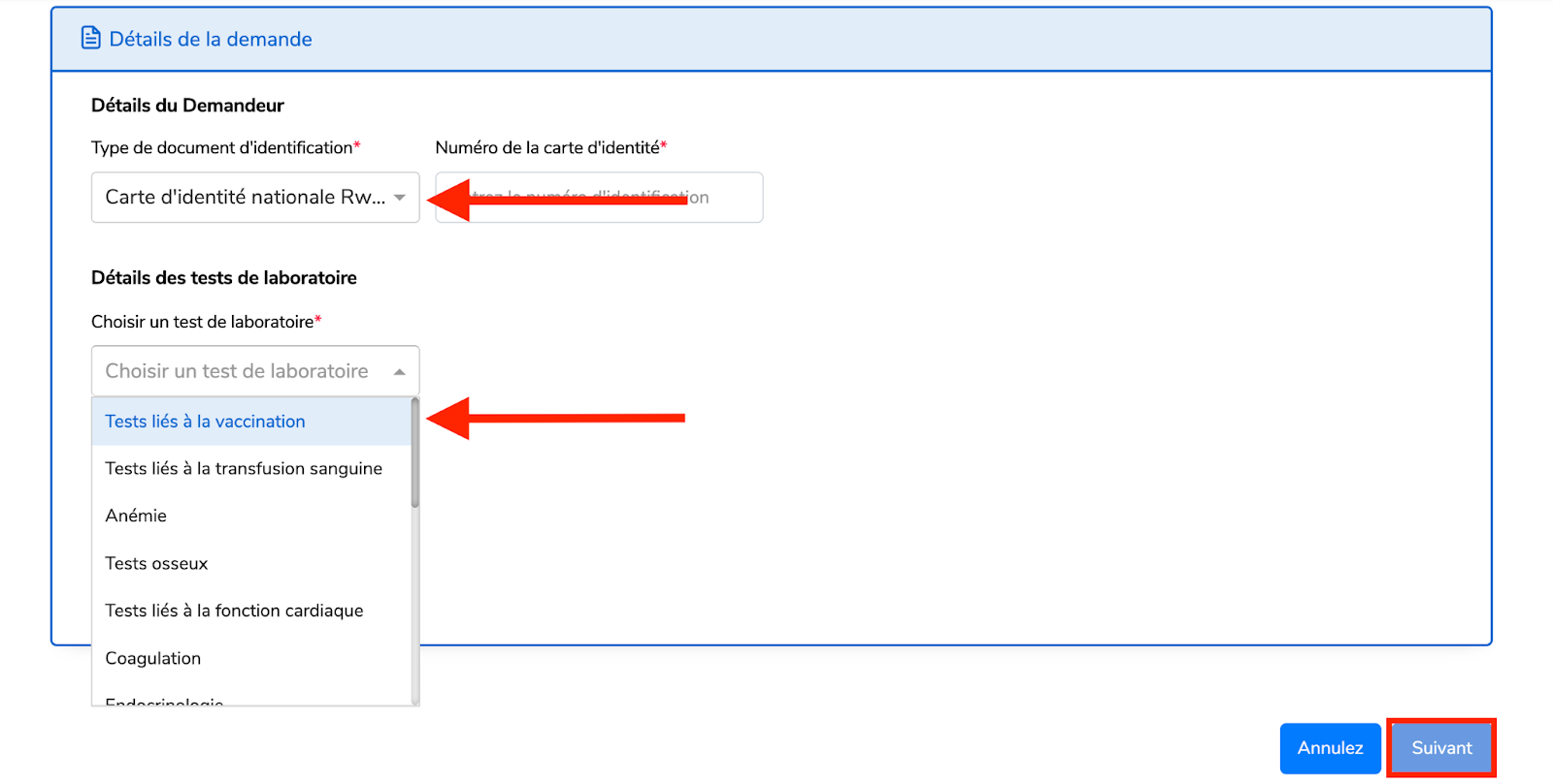 Renseignez les informations du demandeur et sélectionnez le test de laboratoire, puis cliquez sur Suivant.