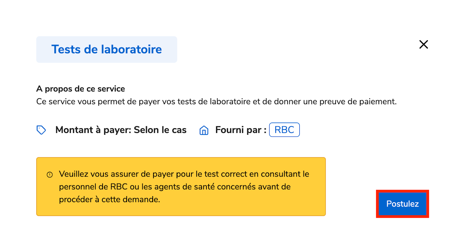 Après avoir sélectionné Test de laboratoire, cliquez sur Postulez.