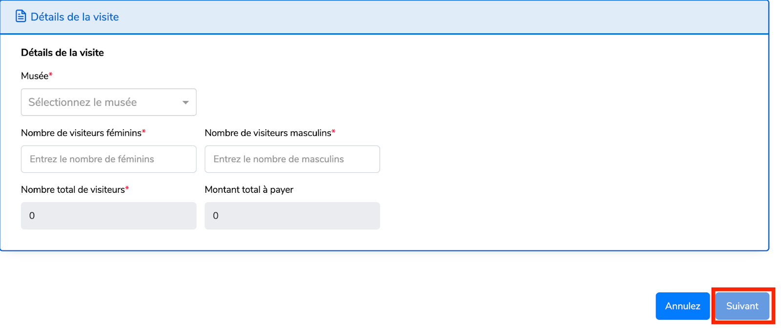 Remplissez les détails de la visite,en incluant aussi les nombre de visiteurs(Masculins ou Féminins),puis cliquez sur “Suivant”.