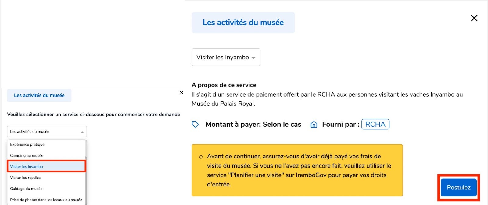 NOTE: Veuillez vous assurer d'avoir payé vos frais de visite du musée avant de continuer. Si vous ne l'avez pas encore fait, veuillez utiliser le service “Planifier une visite” sur IremboGov pour régler vos frais d'entrée.