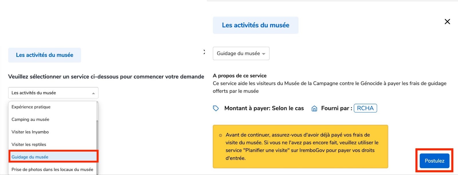 NOTE: Après avoir soumis la demande et effectué le paiement avec succès via IremboGov,votre demande de guidage du musée sera traitée,puis vous recevrez une notification par SMS et/ou par e-mail.